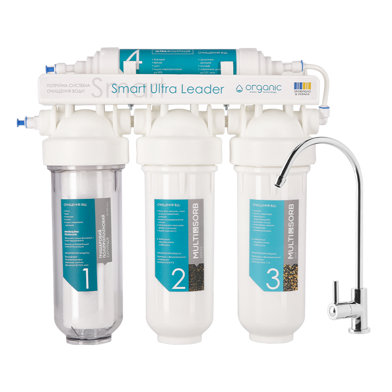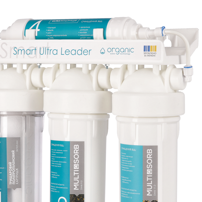 Три картриджі забезпечують ефективне очищення водопровідної води від усіх типових домішок. Ультрафільтраційна мембрана видаляє бактерії та віруси без застосування реагентів. Покращений поліпропіленовий картридж, виготовлений за запатентованою технологією, ще ефективніше очищає воду від механічних домішок.