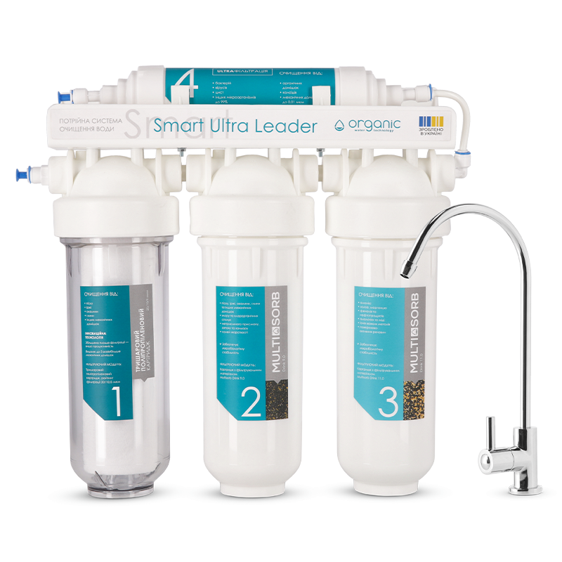 Три картриджі забезпечують ефективне очищення водопровідної води від усіх типових домішок. Ультрафільтраційна мембрана видаляє бактерії та віруси без застосування реагентів. Покращений поліпропіленовий картридж, виготовлений за запатентованою технологією, ще ефективніше очищає воду від механічних домішок.